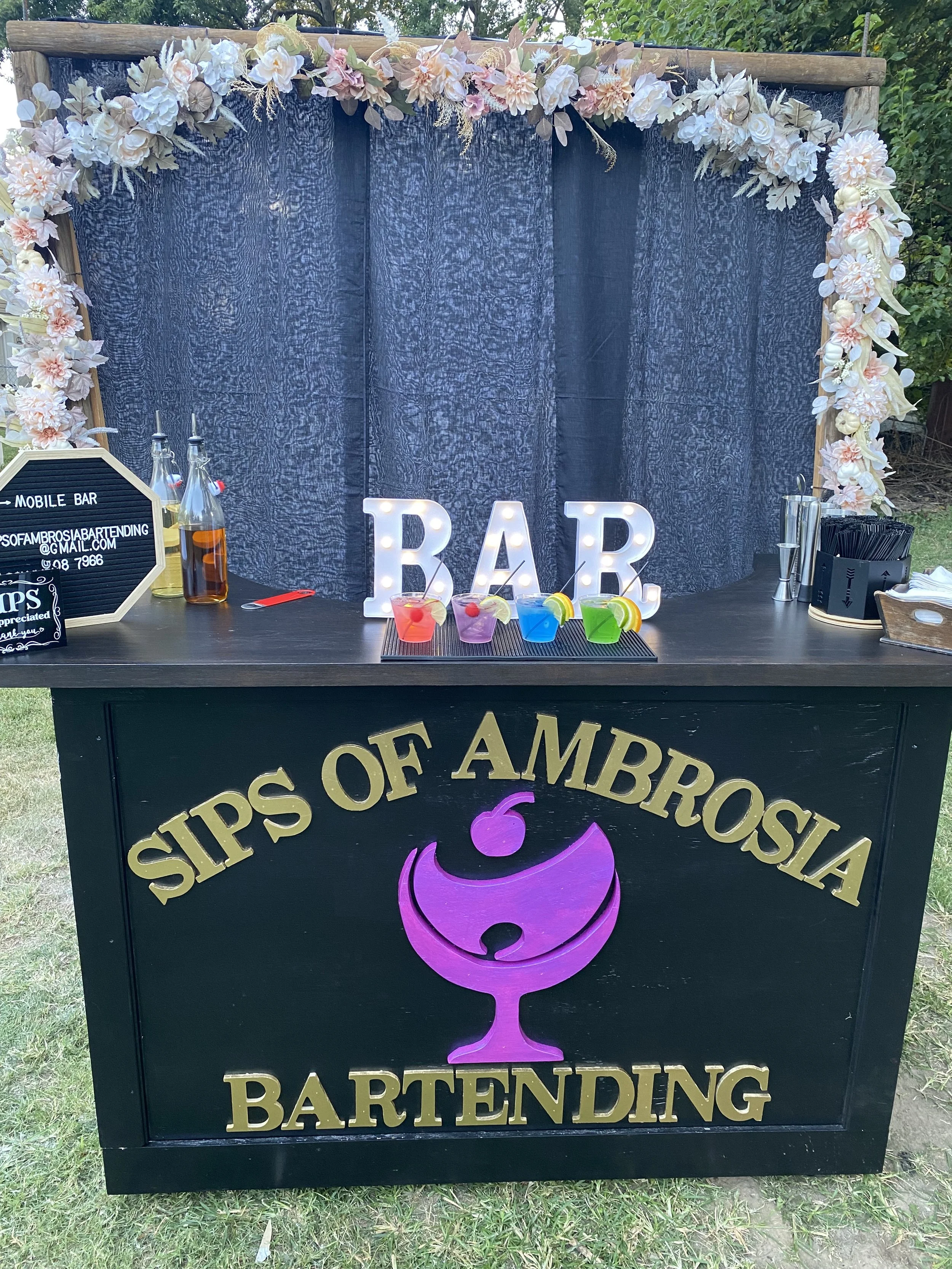 At Sips Of Ambrosia Bartending our passion is to transform your events into unforgettable experiences with great drinks and exceptional service. Whether it’s a wedding, corporate event, or an intimate gathering, our bartenders craft cocktails that reflect your unique style and taste. We are committed to making your moments special. mixing memories, one drink at a time. Let us bring the bar to you and elevate your next event with our signature touch.